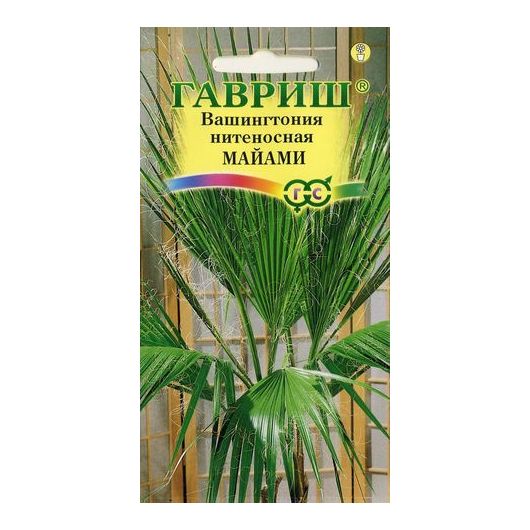Красивая многолетняя пальма достигающая в природе 20 м. Растение неприхотливое, очень интересное для комнатного цветоводства. Вашингтония нитеносная отличается от вашингтонии робусты относительно невысоким, но толстым стволом, и более рыхлой кроной. Она предпочитает расти в сухих местах и чуть более устойчива к холоду. Эффекные зеленые веерные листья (до 2 м) на развитых черешках состоят из многочисленных листовых сегментов, между которыми свисают тонкие кудрявые нити. В природных условиях засохшие листья отгибаются книзу и висят на дереве, образуя вокруг ствола широкую "юбку" . В домашних условиях увядающие листья удаляют вместе с большей частью черешка, остатки черешков одревесневают и образуют мощный ствол. Цветет весной длинными кистями с ароматными желтыми или белыми цветами. С конце лета созревают красно-черные плоды с овальными семенами. Размножается семенами. Семена замачивают на двое суток в теплой воде, затем высаживают в рыхлый субстрат из дерновой, листовой земли и песка (2:2:1).