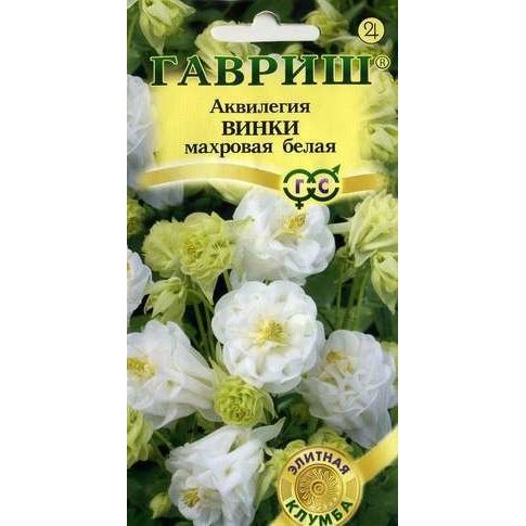 Многолетнее растение из семейства Лютиковые. Аквилегия серии Винки ценится за компактный куст с объемной нежной листвой и возвышающийся на прочных цветоносах букет махровых цветков, которые смотрят вверх и никогда не поникают. Растение невысокое, до 35-45 см. Цветение суперобильное, с конца мая до середины июля. Цветки махровые, чисто-белые, 4 см в диаметре. Влаголюбива. Желательно высаживать в полутени, может расти и на солнечных участках. К почве нетребовательна, предпочитает легкие, хорошо удобренные, дренированные участки. Размножают посевом в открытый грунт в мае или под зиму. При весеннем посеве семена необходимо 2 недели выдержать во влажном песке в холодильной камере. Семена прорастают через месяц при температуре 20-22 о С. Предназначена не только для выращивания в открытом грунте, но и для горшечной культуры.