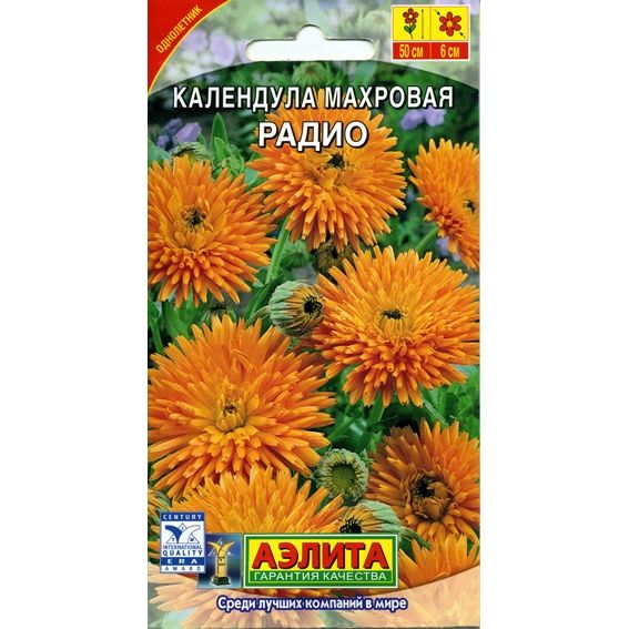 Крупные полушаровидные махровые соцветия новой календулы Радио имеют оригинальную лучистую форму: яркие желто-оранжевые язычковые цветки закручены в трубочки и образуют своеобразные "антенны". Компактные кустики покрыты светло-зелеными листьями.