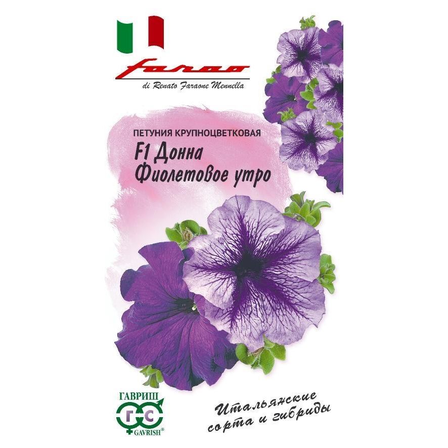 Роскошные раннецветущие гибриды итальянской серии F1 Донна. На компактных кустиках распускаются в большом количестве крупные (10-12 см) цветки насыщенно-фиолетовой и нежно-сиреневой с темными прожилками-лучиками окраски. Выращивают рассадным способом. Посев проводят с января по апрель, поверхностно, под стекло (после появления всходов стекло убирают). В зимние месяцы январь-февраль досветка обязательна. При ранних сроках посева цветение начинается в мае, что очень удобно для выращивания растений на балконе, закрытых террасах, патио. Без дополнительного освещения петунию высевают не раньше марта. Всходы появляются через 7-12 дней. На постоянное место высаживают, когда минует опасность заморозков. Светолюбива и достаточно засухоустойчива. Предпочитает легкие, плодородные, хорошо дренированные почвы. Петунии можно выращивать в течение нескольких лет, сохраняя зимой в освещенном помещении (растение сильно обрезают, t не более 12°С, умеренный полив).