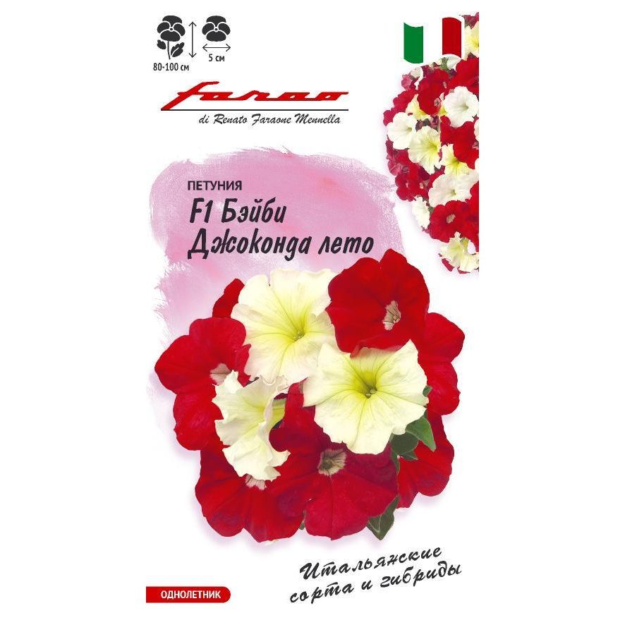 Серия «Бейби Джоконда» отличается интенсивным ветвлением побегов и формирует мощный каскад зелени с большим количеством цветов. Превосходит каскадные формы по многим параметрам, включая «сурфинию». Побеги, свисающие на длину 80–100 см, эффектно выглядят в подвесных корзинах и балконных ящиках. Цветение обильное и не прекращается до заморозков. Смесь состоит из красных цветов с глазком и белых цветов с лаймовым глазком. Габитус растения зависит от плотности посадки. При высадке с шагом 30 см побеги растут вверх, образуя «подушку» из цветков высотой 20 см. Крепкие стебли держат форму в течение всего сезона. При расстоянии 60 см растения разрастаются как почвопокровные во всех направлениях, занимая площадь около 1 м². Выращивают рассадным способом. Семена в гранулах раскладывают (не заделывая!) по поверхности увлажнённого, слегка утрамбованного субстрата. Емкость накрывают прозрачной пленкой и помещают в хорошо освещённое место с температурой не ниже +18°C. Увлажняют при необходимости из пульверизатора. При попа
