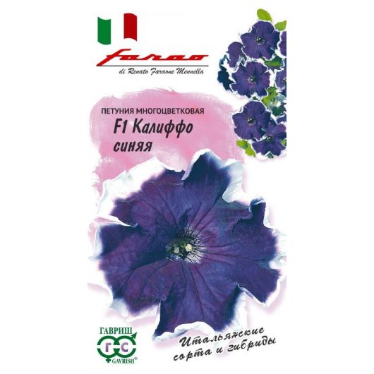 Многоцветковые петунии F1 Калиффо — итальянские красавицы для создания уютного уголка солнечного средиземноморья в саду и на балконе. Аккуратные «точеные» кустики густо покрывают нарядные цветки диаметром 5 см. Глубину оттенка подчеркивает бархатистая текстура цветков, а яркий белый ободок по краю придает контрастности. Посев проводят поверхностно, не заделывая, с февраля по март. При зимнем посеве всходам необходима подсветка. Всходы появляются через 7-12 дней. На постоянное место высаживают, когда минует опасность заморозков. Цветет с конца мая весь сезон. Светолюбива и достаточно засухоустойчива. Предпочитает легкие, плодородные, хорошо дренированные почвы. Украсит контейнеры, вазоны, балконы, подоконники, рабатки, бордюры.