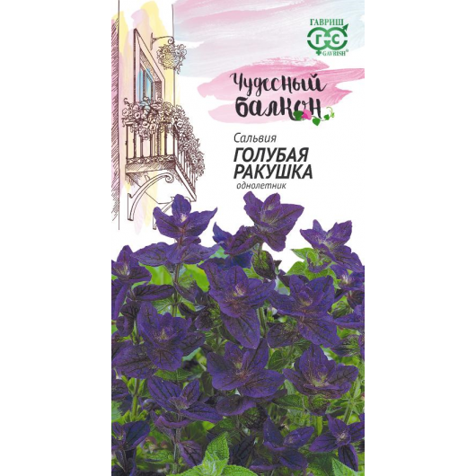 Этот сорт привнесет в балконную композицию ощущение свежести и уравновесит яркие краски. Растение однолетнее, компактное, высотой45 см, очень привлекательное благодаря сине-фиолетовым прицветным листьям, собранным в длинные (15-25 см), простые соцветия. Растение декоративно уже через месяц после посева. Цветет с середины июня до поздней осени, сохраняя свою декоративность. Предпочитает солнечные места и почвы без избытка органических удобрений. Посев проводят поверхностно, не заделывая, в марте в рассадные ящики на глубину 0,5-0,8 см и ставят на свет. Всходы появляются через 7-14 дней, после чего саженцы пикируют. На открытый балкон рассаду высаживают, когда минует угроза весенних заморозков (25 мая-15 июня). Расстояние между растениями15 см. Для придания сальвии объема, молодые растения многократно прищипывают.