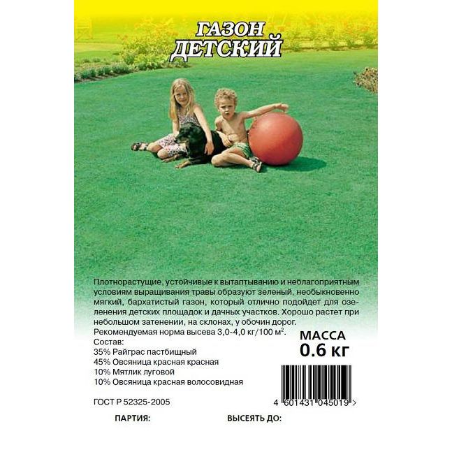 Плотно растущие, устойчивые к вытаптыванию и неблагоприятным условия выращивания травы образуют зеленый, необыкновенно мягкий, бархатистый газон, который отлично подойдет для озеленения детских площадок и дачных участков. Хорошо растет при небольшом затенении, на склонах, у обочин дорог. Рекомендуемая норма высева 3,0-4,0 кг/100 м². Состав: 35% Райграс пастбищный 45% Овсяница красная красная 10% Мятлик луговой