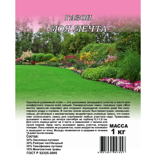 Красивый ухоженный газон — это украшение загородного участка и место для комфортного отдыха всей семьей. Универсальная смесь газонных трав «Моя мечта» идеально подойдет для создания изумрудной лужайки даже без регулярного ухода и стрижки. В состав газона вошли быстрорастущие, теневыносливые, устойчивые к механическому воздействию злаковые травы, что позволяет использовать смесь для озеленения любых участков сада. Травосмесь высевают с весны до начала сентября на глубину 0,1-1,0 см. Для этого семена делят на 2 части и смешивают с песком или сухой землей. Одну часть высевают вдоль участка, вторую поперек. Пока семена не укоренятся, газон аккуратно поливают и защищают от птиц. Всходы появляются в среднем в течение 14 дней после посева. Состав: 30% Овсяница луговая, 30% Райграс пастбищный, 30% Тимофеевка луговая, 10% Многолетние травы