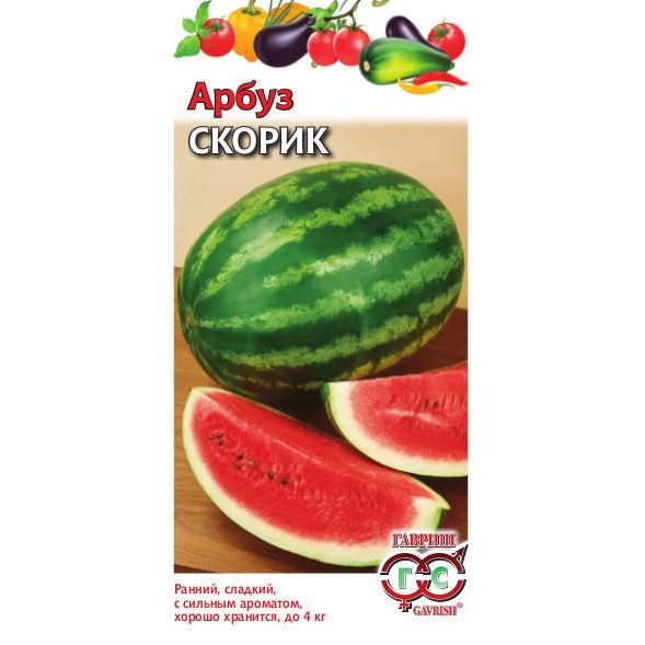 Скороспелый (от всходов до первого сбора плодов 62-87 дней) сорт. Растение плетистое, главная плеть длинная. Плод округлый, гладкий, массой 2-4 кг. Кора средней толщины, зеленая, с рисунком в виде темно-зеленых шиповатых полос. Мякоть ярко-красная, волокнистая, нежная, сочная, сладкая, с сильным арбузным ароматом. Сорт ценится за дружное формирование раннего урожая и отличный вкус. Слабо поражается бактериальной пятнистостью и мучнистой росой. Плоды хорошо хранятся. Урожайность до 3 кг/м².