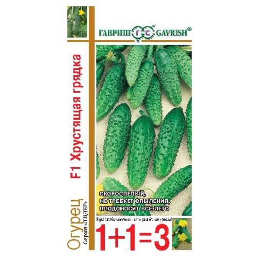 Скороспелый (46-48 дней от всходов до плодоношения) партенокарпический гибрид с букетным расположением завязей (максимально 10-12 цветков в пазухе!). Предназначен для выращивания в открытом и защищенном грунте. Зеленец длиной 10-11 см, массой 90-100 г, частобугорчатый, белошипый, без горечи. Плоды темно-зеленой окраски со светлыми полосами. Использование плодов универсальное. Гибрид отличается ранним, обильным и продолжительным плодоношением, устойчив к настоящей и ложной мучнистой росе, корневым гнилям. Урожайность одного растения 5,4-7,2 кг. Посев на рассаду — в конце апреля. Высадка рассады в грунт — в конце мая – начале июня. Высадка рассады производится в фазе 3-4-х настоящих листьев. Посев непосредственно в теплицу — в середине мая. Схема посадки: 50х50 см.