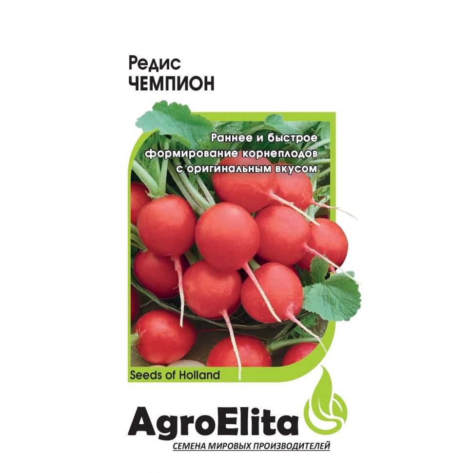 Само название редиса говорит о том, что по многим показателям данный сорт является чемпионом. По вкусовым качествам, пользе и урожайности он не сравнится ни с одним своим родственником. Раннеспелый сорт, через 24-27 дней можно собирать сочные и хрустящие плоды. Розетка листьев компактная, полуприподнятая. Корнеплоды ярко-красные, удлиненно-округлой формы, со слегка выпуклой головкой, гладкие, массой 18-20 г, полностью погружены в почву. Мякоть белоснежная, плотная, нежная, без внутренних пустот, с оригинальным сладковато-острым вкусом. Сорт отличается прекрасными товарными свойствами: не высыхает и не дрябнет в процессе долгого хранения и отлично переносит транспортировку на дальние расстояния. Используют для приготовления салатов и окрошки, а также овощной нарезки и холодных закусок. Посев в открытый грунт проводят в конце апреля-начале мая, июле на глубину 1 см. Устойчив к различным видам заболеваний, цветушности. Предпочитает рыхлые, плодородные почвы.