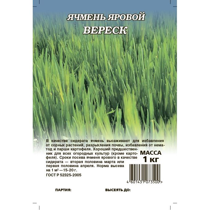 В качестве сидерата ячмень высаживают для избавления от сорных растений, разрыхления почвы, избавления от нематод и парши картофеля. Хороший предшественник для всех огородных культур (кроме картофеля). Сроки посева ячменя ярового в качестве сидерата — вторая половина марта или первая половина апреля. Норма высева на 1 м²—15-20 г.