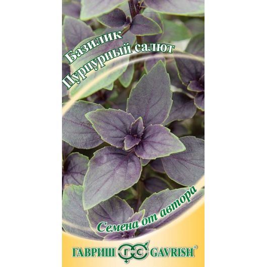 Раннеспелый урожайный сорт базилика с насыщенным гвоздичным ароматом. К массовой уборке зелени приступают через 40-45 дней после появления всходов. Растение очень красивое, высотой 30-40 см, с аккуратной приподнятым розеткой, диаметром 22-25 см. Листья среднего размера, яйцевидные, гладкие, зелено-фиолетового цвета. Базилик придает особый аромат традиционным супам и бульонам, это аппетитная и полезная приправа к мясу, рыбе, свежим салатам и утренним сэндвичам. Благодаря декоративным качествам, кустик Пурпурного салюта, пересаженный в горшок, станет украшением кухонного интерьера. Выращивают рассадным способом или прямым посевом в открытый грунт. Посев на рассаду производят в конце марта – начале апреля. Посев в грунт — в мае или начале июня. Высадка рассады в грунт – начало июня. Схема посадки: 30x30 см. Предпочитает хорошо структурированные, богатые гумусом почвы. Нуждается в регулярных поливах.